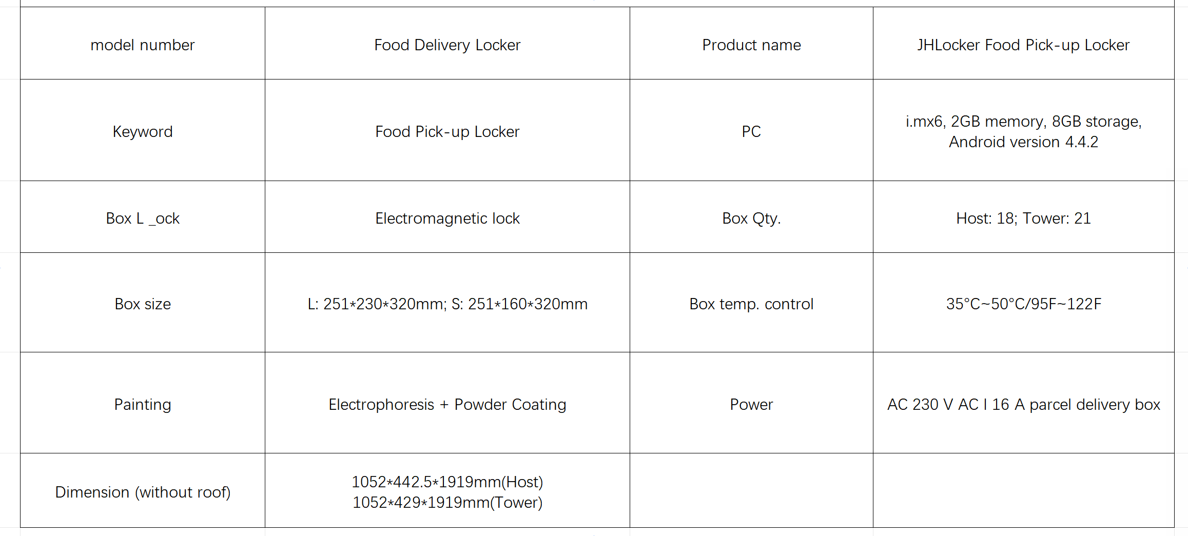 Feature highlights:The JHLocker Touch Screen QR Pin Code Food Delivery Locker is designed for smart restaurants, featuring electromagnetic locks, UVC lamp disinfection, and temperature control ranging from 35℃ to 50℃. Constructed with cold rolled steel plate DC01 and electrophoresis plus powder coating, it ensures durability and a sleek finish. The locker offers 18 host boxes and 21 tower boxes with customizable power options, supporting a max power consumption of 550W (host) and 600W (tower).