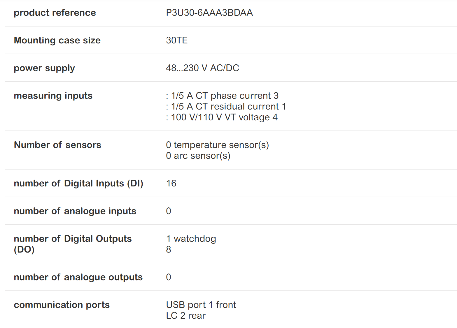 Perfectly suited for buildings and industry, utilities, and large industrial processes. The relay include protection for overcurrent, overload, broken conductor, earth-fault and breaker failure as per ANSI. It also feature an automatic recloser, a switch ON to fault, inrush protection and lockout among others. Simple, reliable, safe and easy-to-use, thanks to the User Interface display. The protection relay can to be supplied by a 48 VAC/VDC to 230 VAC/VDC network. It include 16 digital inputs, a LC communication port and 1 USB on front of the device. Mechanical dimensions are 169.5 mm in height, 170 mm in width and 205 mm in depth. The relays are certified with EN 60255-26 for electromagnetic compatiblity. The device is compatible with aditional modules and accessories: connection cables, communication modules, temperature and analogue input and output modules, LPVT & PLCT option, arc flash sensors, and other accessories.