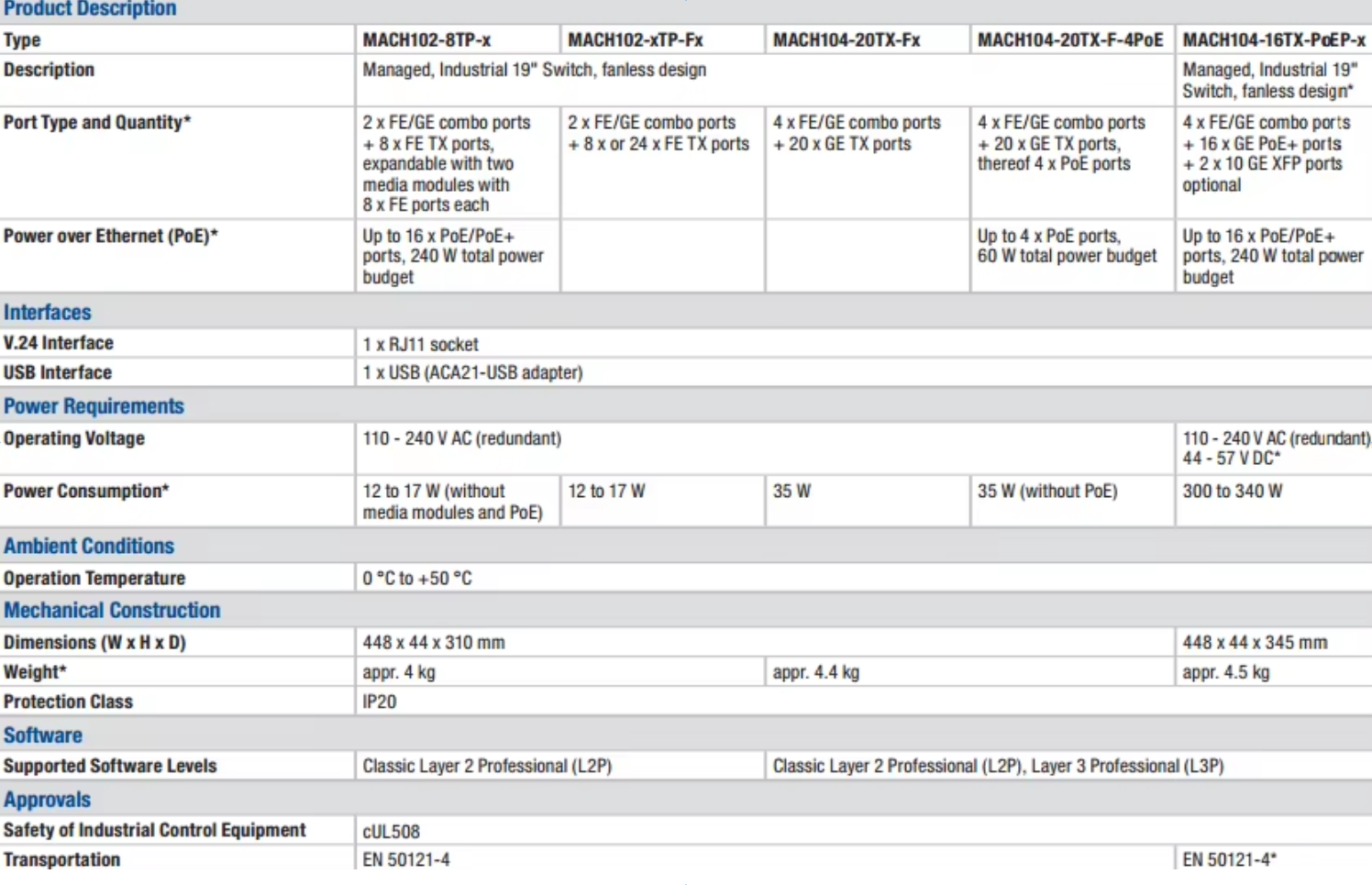 environmental conditions. The MACH100 workgroup switches can tolerate temperatures from 0 °C to +50 °C, fanless (exception select PoE models) These workgroup switches can be installed in control cabinets without any