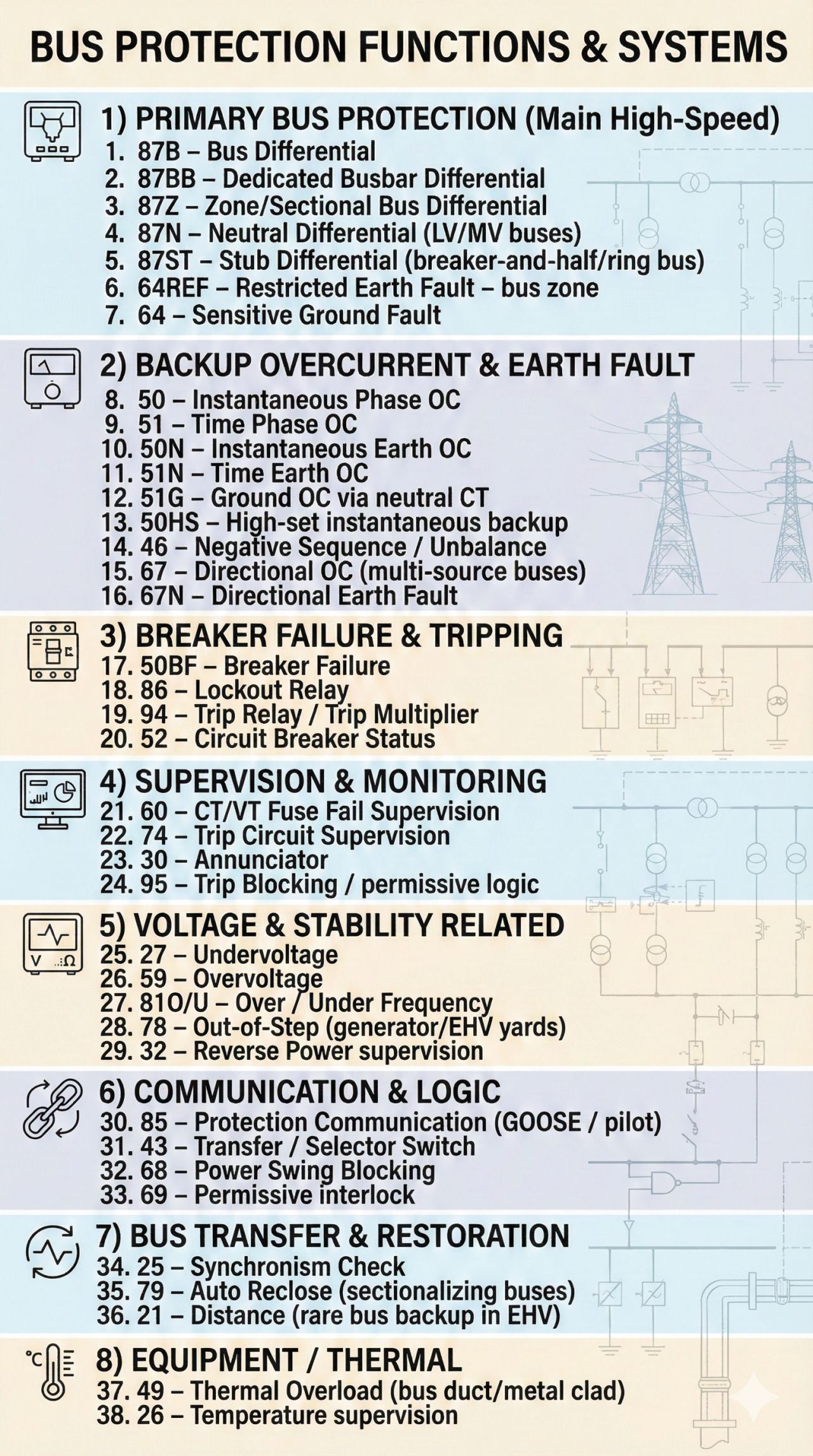 • 87Z – Zone/Sectional Diff: Protects individual bus sections in double bus systems.