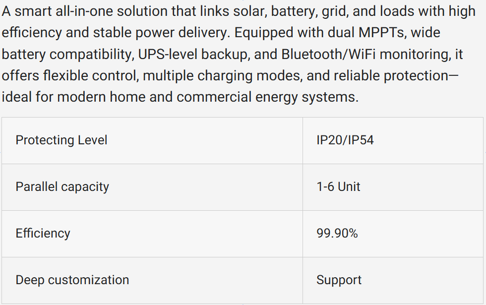 With dual MPPT tracking, wide battery compatibility, uninterrupted power supply capability, and smart monitoring via Bluetooth/WiFi, it brings high performance and easy control together. A capacitive touch display, multiple charging modes, and comprehensive protection functions ensure a reliable and flexible user experience for everyday energy management.